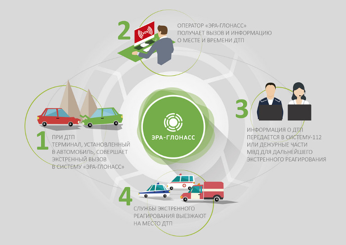 Терминал ЭРА-ГЛОНАСС обеспечивает соединение с оператором после активации кнопки экстренного вызова. После того как сотрудник системы ЭРА-ГЛОНАСС получает сигнал, ему становятся доступны сведения о месте положения транспортного средства. Таким образом, диспетчер получает возможность направить на место аварии всю необходимую помощь гораздо быстрее и по планам создателей системы это спасёт тысячи жизней.