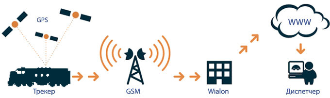 Терминал ГЛОНАСС/GPS получает данные о местоположении со спутников, опрашивает установленные дополнительно датчики на предмет текущих показателей и далее по каналу сотовой связи передаёт готовый пакет данных на сервер. В случаи движения в месте отсутствия сотовой связи, данные записываются на внутреннюю независимую память («чёрный ящик») трекера и при вхождению в зону покрытия оператором, показания выгружаются на сервер в полном объеме, без потерь.