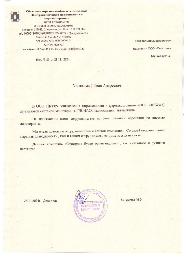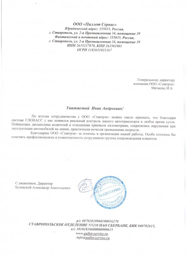 С большим удовольствием хотим отметить, что после начала работы с ООО «Ставтрэк» и внедрения системы ГЛОНАСС у нас существенно улучшился контроль за транспортом. Благодаря новому подходу повысилась дисциплина наших водителей, заметно снизились нарушения и улучшилась общая эффективность эксплуатации автомобилей. Выражаем искреннюю благодарность за профессионализм и квалифицированную поддержку сотрудников компании!