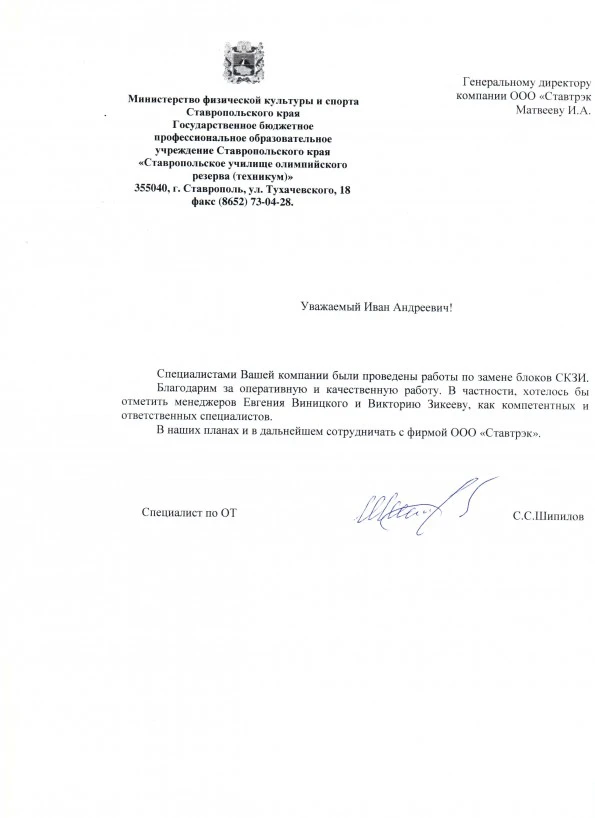 Благодарим команду компании Ставтрэк за оперативную замену блоков СКЗИ. Особая признательность менеджерам Евгению Винницкому и Виктории Зикеевой за компетентность и ответственность. Мы будем рады продолжать наше успешное сотрудничество!