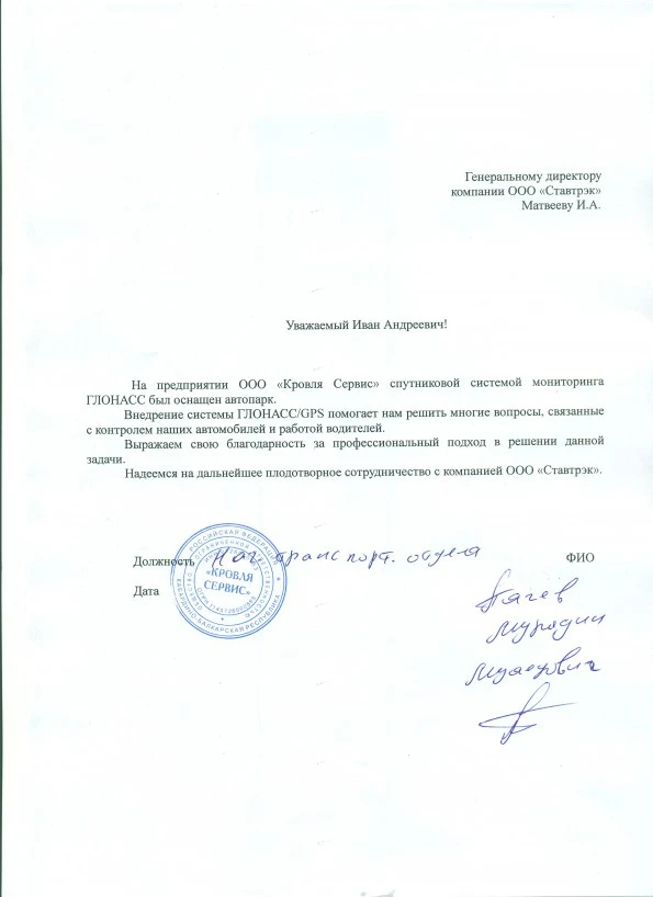 Компания «Кровля Сервис» благодарит команду «Ставтрэк» за успешное оснащение своего автопарка системой мониторинга ГЛОНАСС/GPS. Отмечаем, что благодаря профессионализму компании нам удалось оперативно решить задачи контроля автотранспорта и улучшить работу водителей. Надеемся на дальнейшее плодотворное сотрудничество!
