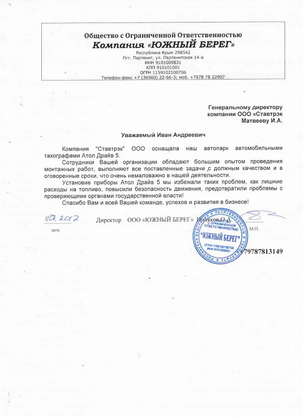 Компания «Ставтрэк» оперативно оснастила наш автопарк тахографами Атол Драйв 5. Высокий уровень обслуживания и профессионализм сотрудников позволили решить задачи монтажа с отличным качеством и в срок. Благодаря этому были оптимизированы расходы на топливо, значительно выросла безопасность и полностью ушли проблемы с контролирующими органами госвласти. Большое спасибо команде «Ставтрэк» за отличную работу! Желаем процветания!