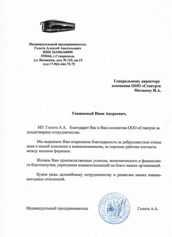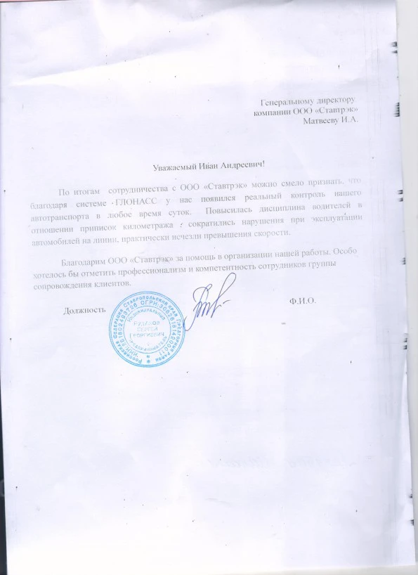 С момента подключения системы ГЛОНАСС от компании Ставтрэк управление нашим автопарком стало удобным и прозрачным. Теперь мы точно контролируем машины 24 часа в сутки, дисциплина водителей существенно выросла, исчезли перепробеги и скоростные нарушения. Искренне благодарим команду за профессионализм и поддержку в работе!