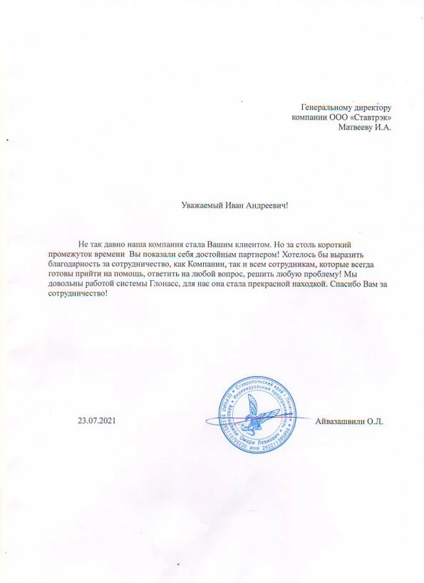 Мы недавно начали сотрудничество с компанией «Ставтрэк», и уже убедились в их высоком профессионализме и готовности помочь в любой ситуации. Особенно хотим отметить отличную работу системы ГЛОНАСС – она стала настоящей находкой для нас. Благодарим команду компании за оперативность и достойную поддержку!