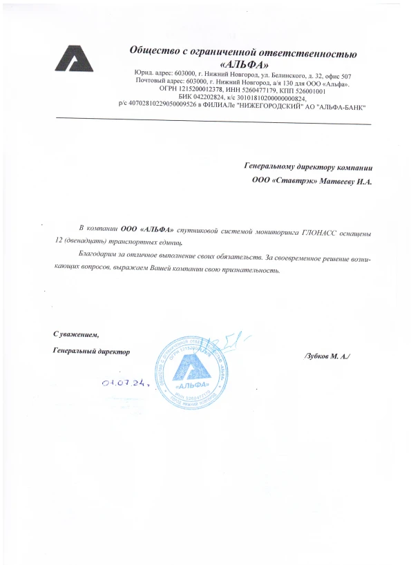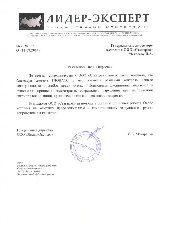 Наше предприятие внедрило систему ГЛОНАСС от компании Ставтрэк и результаты действительно впечатляют! Нам удалось наладить контроль за транспортом в круглосуточном режиме, улучшить дисциплину водителей и существенно уменьшить количество нарушений. Теперь практически исключены превышения скорости и искажения данных о пробеге автомобилей. Благодарим сотрудников команды Ставтрэк за профессиональную поддержку и внимательное отношение к задачам нашей организации.
