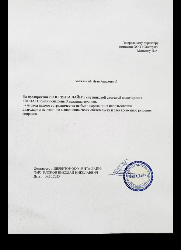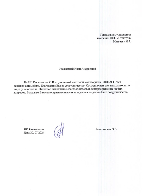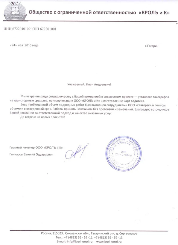Искренне благодарим коллектив ООО «Ставтрэк» за ответственный подход и отлично выполненные работы по установке тахографов и изготовлению карт водителей. Все задачи были выполнены качественно, в полном объеме и точно в срок. Мы полностью довольны результатом и рассчитываем на продолжение такого плодотворного сотрудничества в дальнейшем!