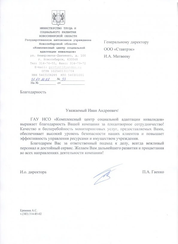 Хотим выразить искреннюю благодарность компании «Ставтрэк» за превосходную работу и надежное сотрудничество. Благодаря вашему ответственному подходу и оперативной поддержке, наши клиенты получили высокий уровень безопасности, а эффективность управления учреждением заметно возросла. Надеемся на дальнейшее успешное сотрудничество и желаем вашей компании развития и процветания!