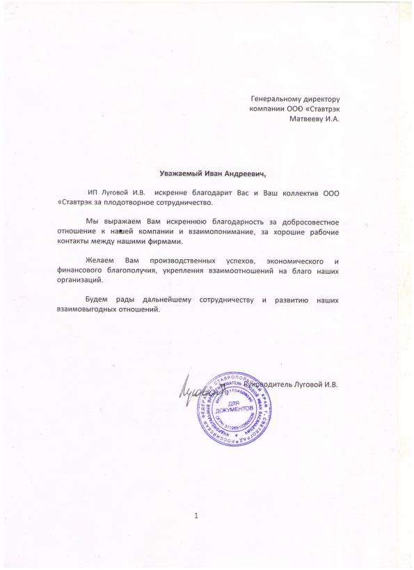 От всей души хочется выразить признательность команде компании «Ставтрэк» за профессионализм и ответственность. Приятно иметь дело с людьми, искренне заинтересованными в общем успехе. Надеемся, что наше сотрудничество продолжится и станет еще более успешным и взаимовыгодным!