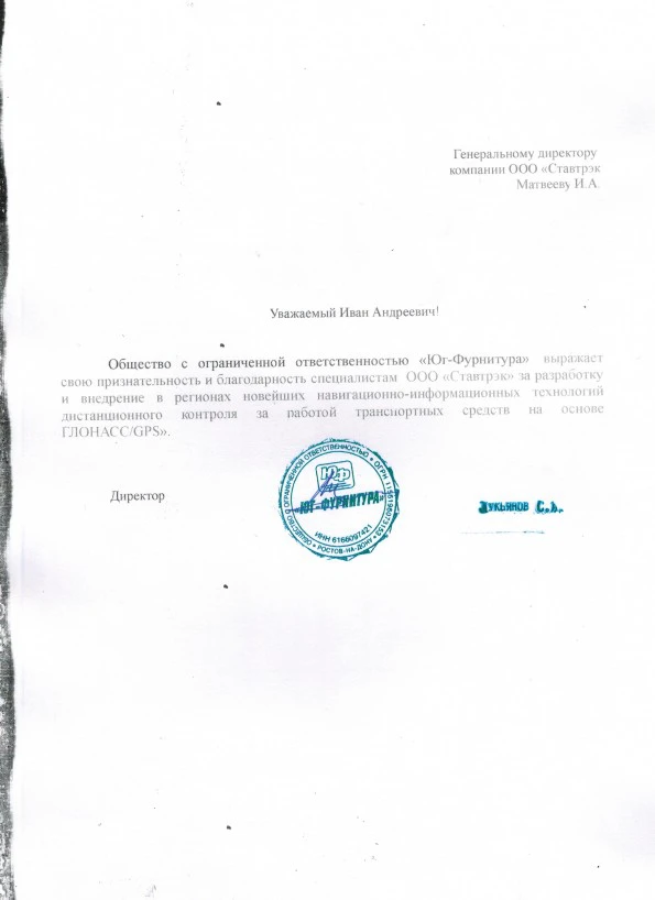 ООО «Юг-Фурнитура» выражает признательность команде Ставтрэк за успешную разработку и внедрение современных навигационно-информационных систем для эффективного удалённого контроля транспорта на базе технологий ГЛОНАСС/GPS. Сотрудничество оставило приятные впечатления от профессионализма и качества работы специалистов.