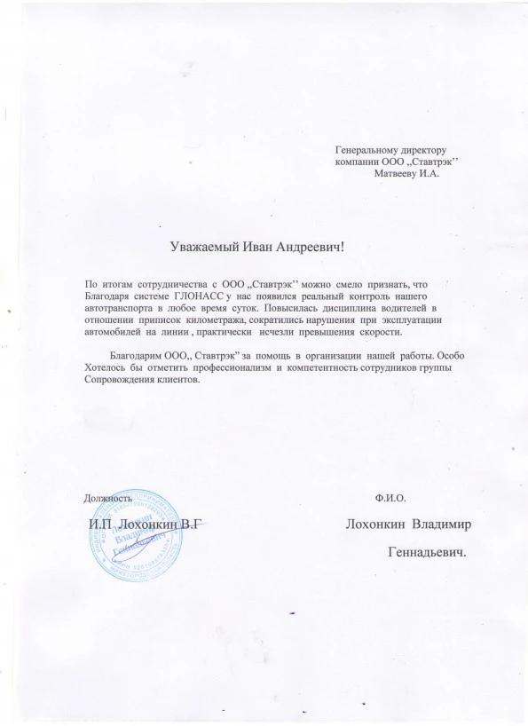 Благодаря системе ГЛОНАСС от компании «Ставтрэк» мы смогли эффективно контролировать транспорт в любое удобное для нас время. Значительно улучшилась дисциплина среди водителей, сократилось количество нарушений скорости, а также исчезли риски приписок по километражу. Хочу особо отметить высокую квалификацию и профессиональный подход сотрудников службы сопровождения клиентов «Ставтрэк» — наше сотрудничество полностью оправдало ожидания!