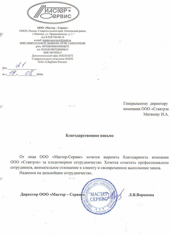 Мы искренне благодарны компании «Ставтрэк» за успешное сотрудничество! Особенно хотим подчеркнуть профессионализм команды, ответственное и внимательное отношение каждого сотрудника, а также оперативность в выполнении заказов. Будем рады дальнейшему совместному развитию!