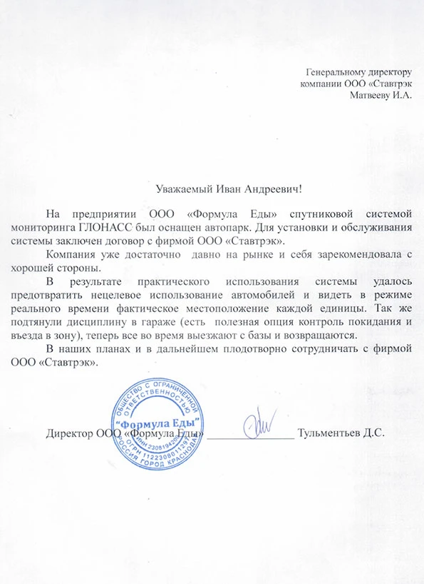 Давно сотрудничаем со Ставтрэк, спутниковая система мониторинга ГЛОНАСС на наших автомобилях великолепно зарекомендовала себя. Мы полностью контролируем перемещения машин, предотвращаем нецелевое использование и убедились, что дисциплина в гараже существенно повысилась. Особенно удобна функция контроля въезда и выезда авто с территории. Будем и дальше развивать плодотворные партнерские отношения со Ставтрэк!