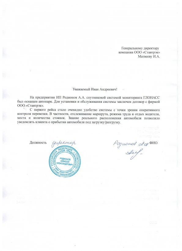 Рады поделиться отзывом о работе с компанией «СТАВТРЭК»! Очень довольны внедрением системы ГЛОНАСС/GPS мониторинга на наших автомобилях и спецтехнике. Теперь работа стала быстрее, контроль топлива эффективнее, а отчетность удобнее. Отдельно отмечаем профессионализм сотрудников компании — всегда готовы оперативно помочь и ответить на все вопросы. Рекомендуем всем, кому нужно качественное решение для увеличения эффективности автопарка!