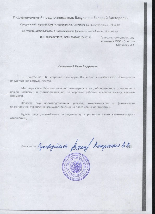 Огромное спасибо коллективу компании «Ставтрэк» за прекрасное сотрудничество! Особенно приятно отметить вашу открытую и ответственную позицию, благодаря которой наши компании смогли наладить отличные взаимовыгодные отношения. Желаем вам процветания, успехов и надеемся на дальнейшее развитие партнерских связей на благо наших организаций!