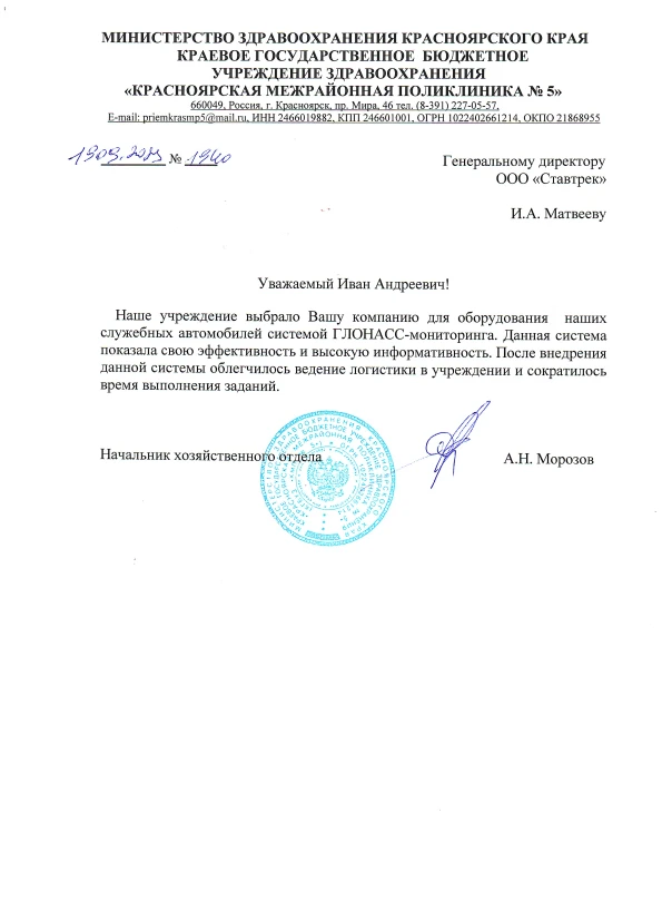Приобретали систему ГЛОНАСС-мониторинга для автомобилей нашего учреждения в компании «Ставтрэк». Система отлично себя проявила, помогла оптимизировать логистику нашего автопарка и заметно сократила сроки выполнения задач. Очень довольны результатом и высоким уровнем обслуживания!