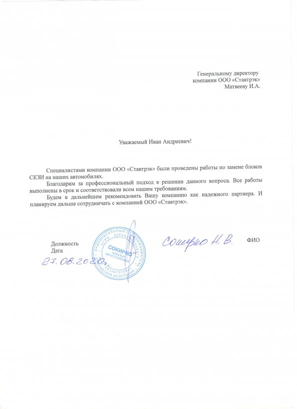 Сотрудники компании «Ставтрэк» профессионально и оперативно выполнили работы по замене блоков СКЗИ на наших автомобилях. Мы очень довольны четкими сроками и высоким уровнем сервиса. С удовольствием рекомендуем «Ставтрэк» как надежного и ответственного партнера и обязательно будем работать с ними снова!