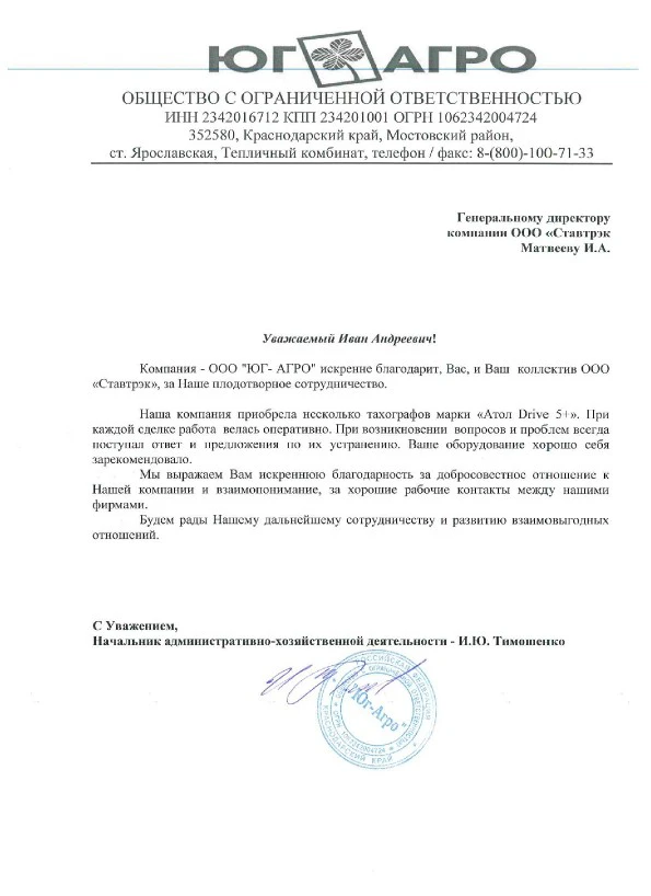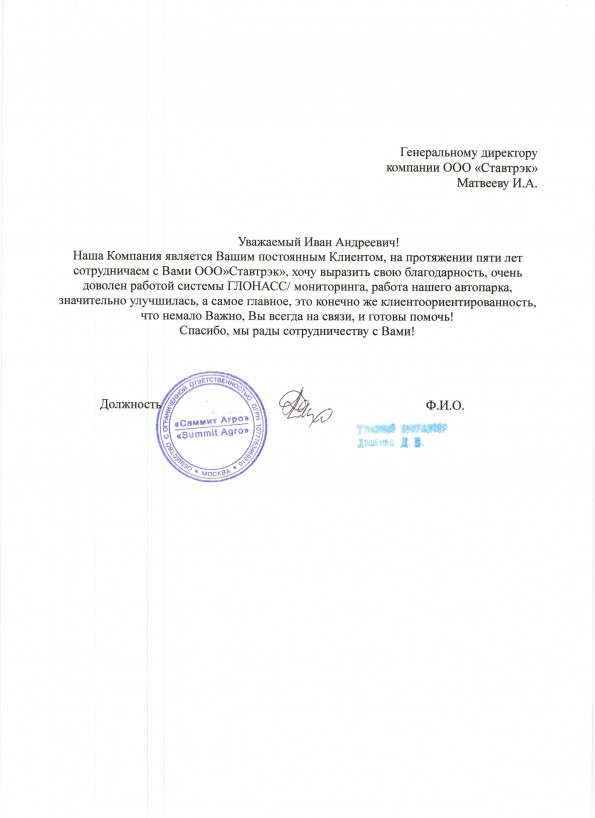 Благодаря сотрудничеству с ООО «Ставтрэк» мы смогли установить эффективный контроль за нашим транспортом с помощью системы ГЛОНАСС. Это привело к повышению дисциплины водителей, существенному снижению нарушений и случаев превышения скорости. Хотелось бы особенно поблагодарить сотрудников, сопровождавших нас, за их профессионализм и подход к работе.