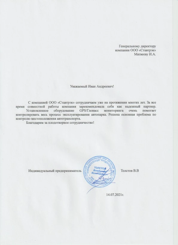 о компании Ставтрэк об установке системы управления транспортом на предприятии ИП Толстов В.В.