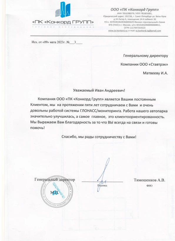 Большая благодарность компании «Ставтрэк» за безупречную помощь и высокую организацию нашего рабочего процесса. Особенно приятно сотрудничать с сотрудниками, которые быстро и эффективно справляются с задачами, качественно решая любые вопросы по программе «Глонасс», и подробно консультируют по всем сложным моментам.