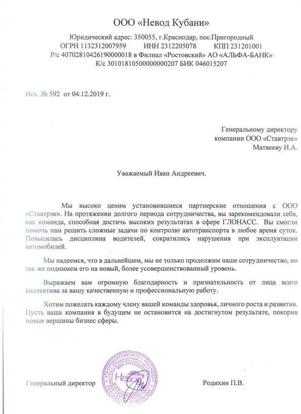 Мы очень довольны нашим сотрудничеством с компанией «Ставтрэк». За долгое время работы специалисты зарекомендовали себя как настоящие профессионалы, способные успешно решать задачи в области ГЛОНАСС, и помогли нам значительно улучшить контроль автотранспорта. Благодаря этому повысилась дисциплина водителей и уменьшилось количество нарушений. Благодарим за качественную работу и желаем компании дальнейшего успешного развития!