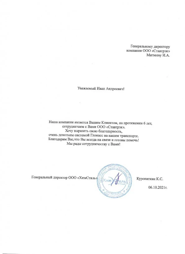 ООО "ХимСталь" о компании Ставтрэк об установке автоматизированной системы контроля транспорта