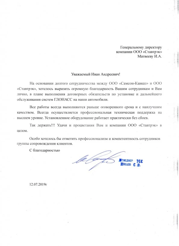 Мы искренне благодарим компанию «Ставтрэк» за успешное и долгосрочное сотрудничество. Хотим отметить оперативность и превосходное качество выполненных работ по установке и обслуживанию систем ГЛОНАСС на наших автомобилях. Приятно впечатлил высокий уровень технической поддержки и бесперебойность работы установленного оборудования. Желаем успехов в дальнейшей работе и отдельно благодарим за профессионализм сотрудников сопровождения клиентов!