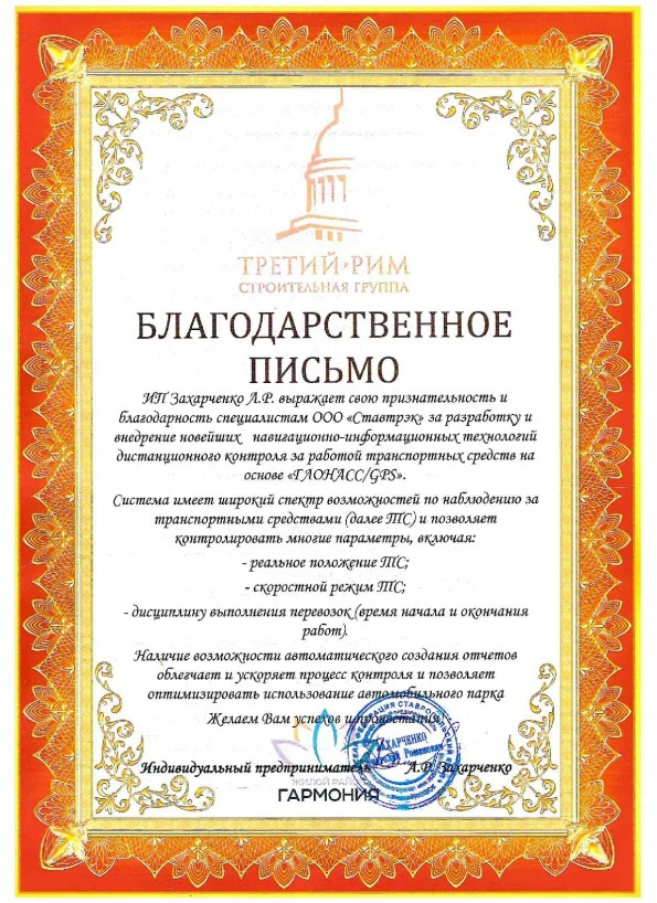 Хотим выразить огромную благодарность команде ООО «Ставтрэк» за внедрение современных технологий контроля транспорта на базе системы ГЛОНАСС/GPS. Это решение позволяет легко отслеживать текущее местоположение и режим скорости автомобилей, а также дисциплину перевозок. Особенно стоит отметить удобную функцию создания отчетов, которая значительно упрощает контроль и помогает эффективно управлять автопарком. Большое спасибо за профессионализм и качество работы!