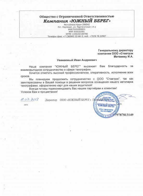 Компания «ЮЖНЫЙ БЕРЕГ» благодарит ООО «Ставтрэк» за высокопрофессиональное и оперативное сотрудничество в области тахографии. Мы особенно ценим готовность к решению вопросов по оснащению автопарка и оформлению водительских карт. С уверенностью рекомендуем «Ставтрэк» как надёжного партнёра!