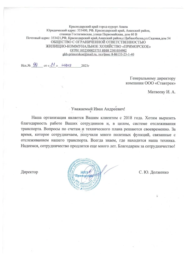 Благодаря системе ГЛОНАСС от компании «Ставтрэк» мы получили полноценный контроль над нашими автомобилями 24 часа в сутки. Заметно улучшились показатели дисциплины водителей, значительно уменьшилось количество нарушений и практически исчезли случаи превышения скорости. Выражаем благодарность сотрудникам «Ставтрэк», отмечая их высокий профессионализм и внимательное отношение к клиентам.