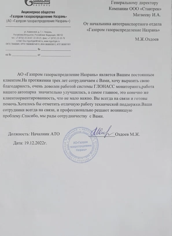 Очень довольны сотрудничеством с компанией Ставтрэк. Благодаря системе мониторинга транспорта существенно снизился расход топлива, а тахографы помогают контролировать соблюдение режима труда. Отдельное спасибо за отзывчивость и профессионализм сотрудников компании. Рекомендуем всем, кто заботится о качестве управления транспортом.