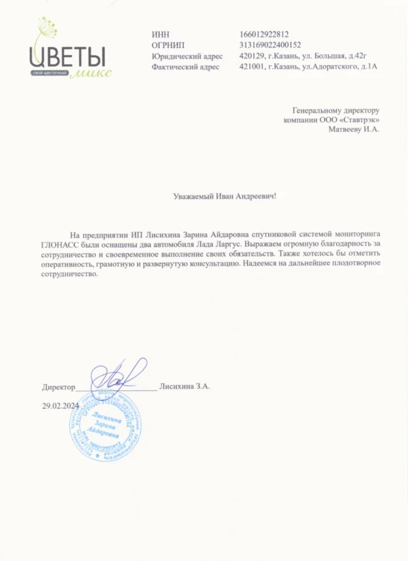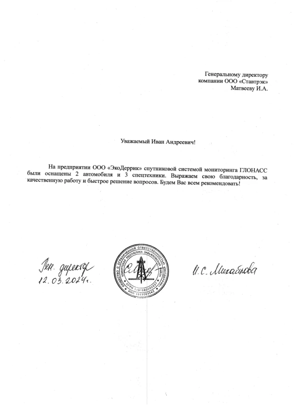 Компания «Ставтрэк» оснащала наш автопарк системой ГЛОНАСС, установив оборудование на два автомобиля Лада Ларгус. Очень довольны скоростью, ответственностью, профессионализмом и детальным консультированием сотрудников. Благодарим за четкую работу и надеемся на дальнейшее успешное сотрудничество!